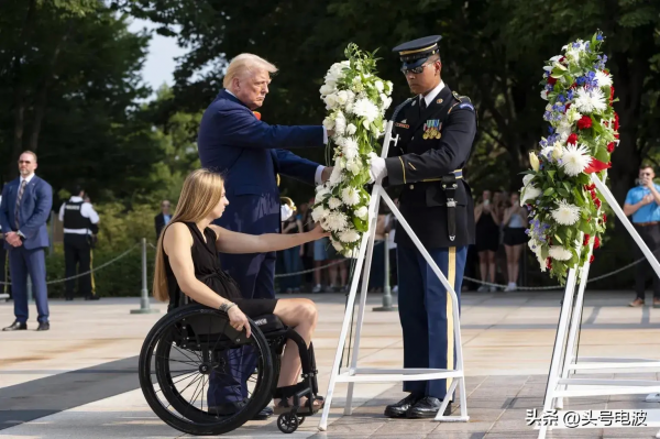 8月26日,特朗普专程去弗吉尼亚州的阿灵顿国家公墓,和阵亡士兵妮可·吉的妹妹米斯蒂·福科一起向妮可·吉中士敬献花圈,表达对美军阵亡士兵的"缅怀"。