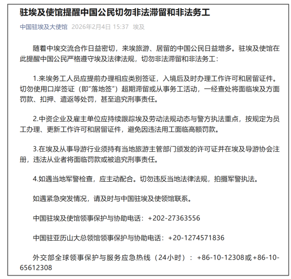 2月4日,驻埃及使馆提醒中国公民切勿非法滞留和非法务工: