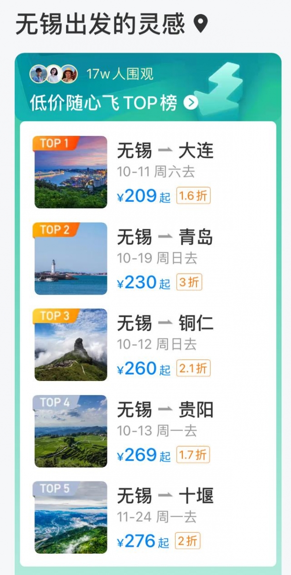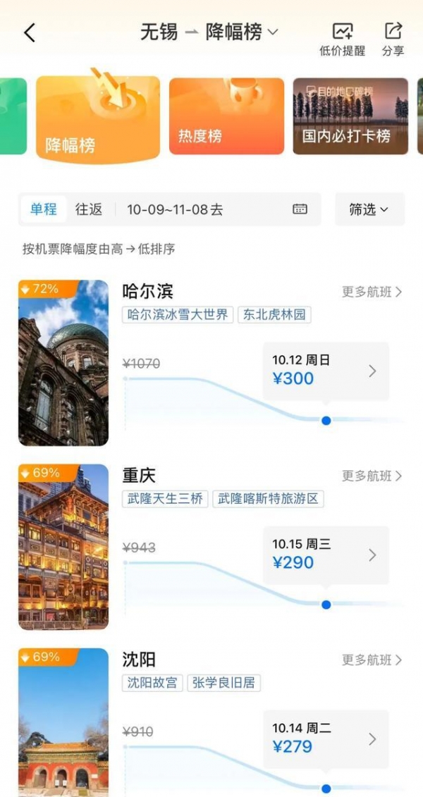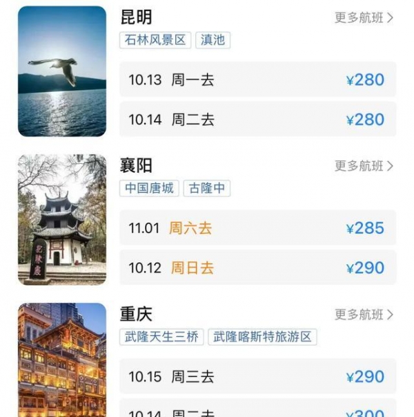 无锡飞哈尔滨300块,还不够请朋友吃顿烤肉;飞重庆290,比打车去苏州园区还便宜;最离谱的是飞沈阳279,单程高铁二等座都买不到。