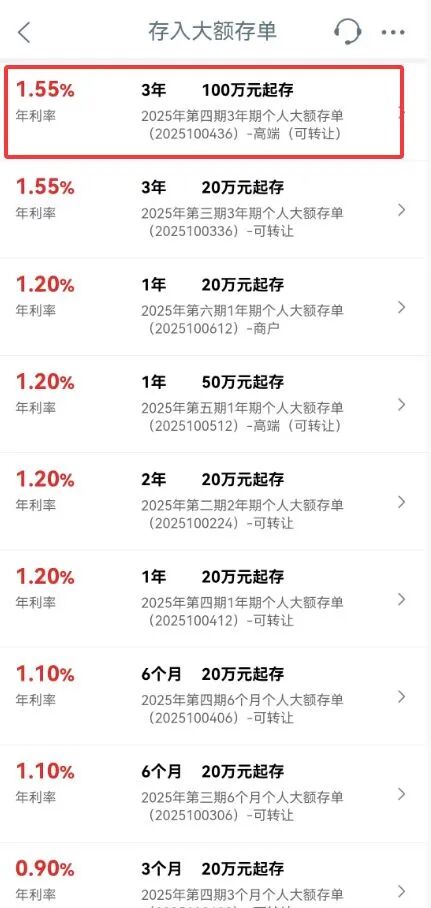 12月3日,据工商银行APP显示,该行正在发售的2025年第四期3年期个人大额存单,起步门槛标注为"100万元起存",而年利率仅为1.55%。而最新的工行三年期定存产品的年利率,标注为"年利率最高可至1.55%",而定存的起步门槛仅为50元。