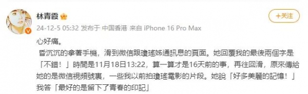 12月5日凌晨,林青霞在社交媒体上发文,深情悼念刚刚离世的著名作家琼瑶。她心痛地回忆起与琼瑶的最后一次交流,时间定格在11月18日,那简单的"不错"二字,竟成了琼瑶对她的最后回复。