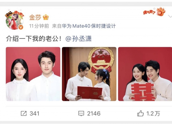 4月9日,金莎在微博晒出与孙丞潇结婚照,官宣两人结婚消息。
