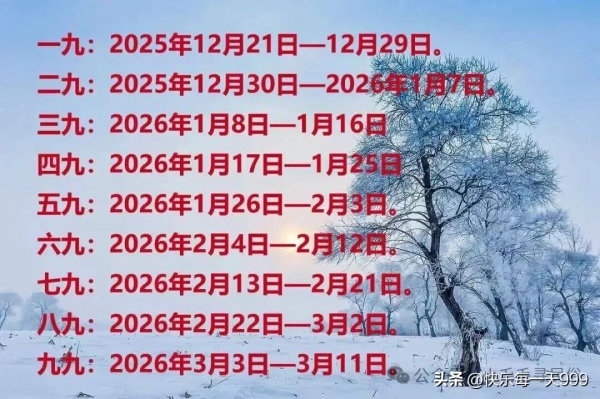 直到现在民间一些地方依然流传着画消寒图(梅花图、文字图)、消寒会等活动,不过流传最广的还属朗朗上口的《数九歌》:"一九二九不出手;三九四九冰上走;五九六九,沿河看柳;七九河开,八九燕来;九九加一九,耕牛遍地走。"按照"冬至当天数九"来说,2025-2026年的数九时间表确定如下图: