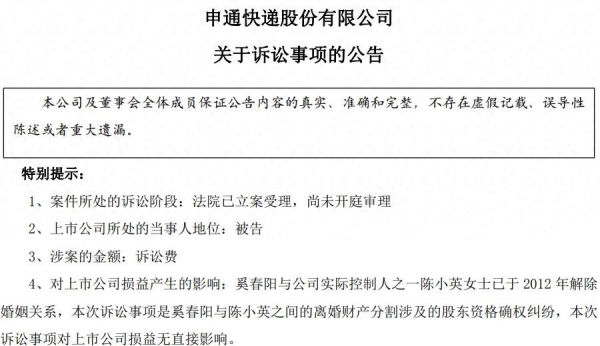 从申通快递公告中披露的诉讼所基于的事实与理由来看,股份分割是"根据双方离婚时对财产分割的约定",算是历史遗留问题。
