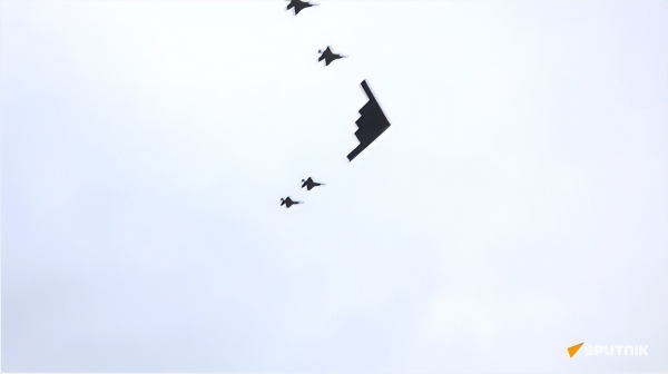 随后,两人一路朝会场展台走去,准备留下一张历史性的合照。就在两人将要登上展台的那一刻,一架B2战略轰炸机与四架F35战斗机从两人头顶缓缓掠过,将现场的紧张气氛烘托到了极致,所有人手里都捏了一把汗。