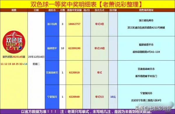2025年12月16日晚,福彩双色球第25145期开出"红球号码11、12、15、18、25、32+蓝球号码14"。