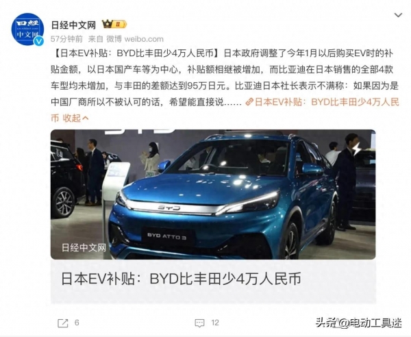 据《日经中文网》报道,日本经济产业省近期发布的""清洁能源汽车引进推广补贴"中,比亚迪4款车型均没有在列了。对此,比亚迪日本社长表达了不满,他认为这种以日本本土车为中心,并且持续增加补贴,而将比亚迪排除在外的方式很不公平。他说:"如果因为是中国厂商所以不被认可的话,希望能直接说……"