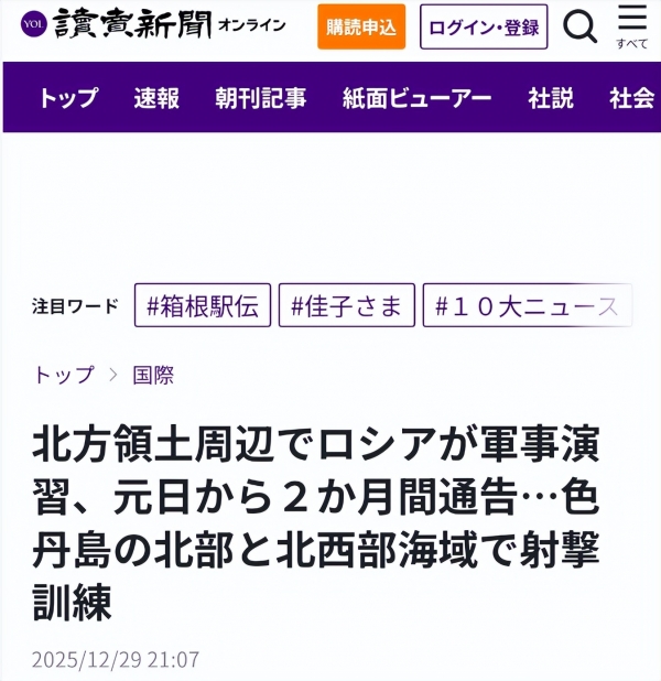 【日本《读卖新闻》29日报道称俄罗斯通知日本将于2026年1月1日起在北海道岛附近水域开展军事演习】