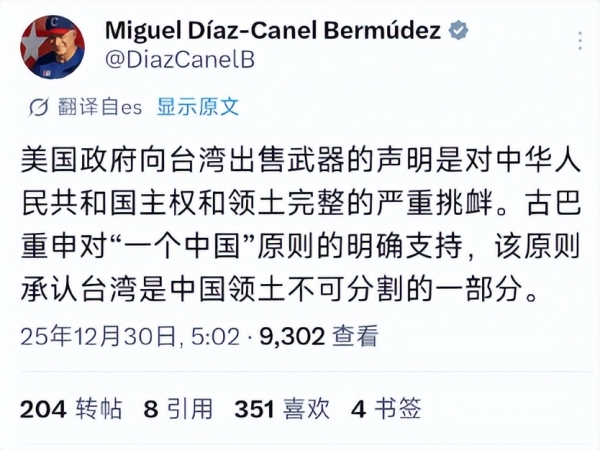 古巴国家主席卡内尔30日在其个人社交平台上发文称,美国政府向台湾出售武器的声明是对中国主权和领土完整的严重挑衅,古巴重申对一个中国原则的明确支持,该原则承认台湾是中国领土不可分割的一部分。