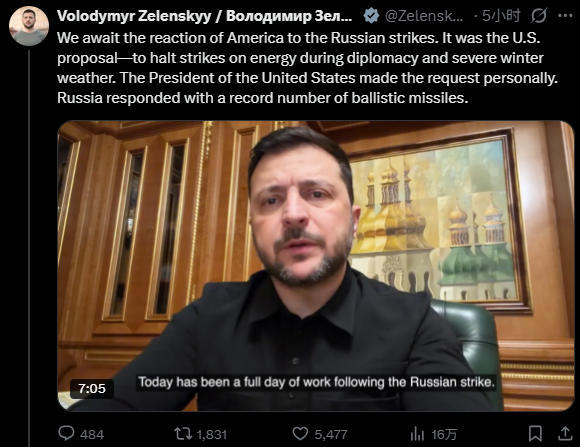 泽连斯基视频讲话:等待美国的回应 推文截图