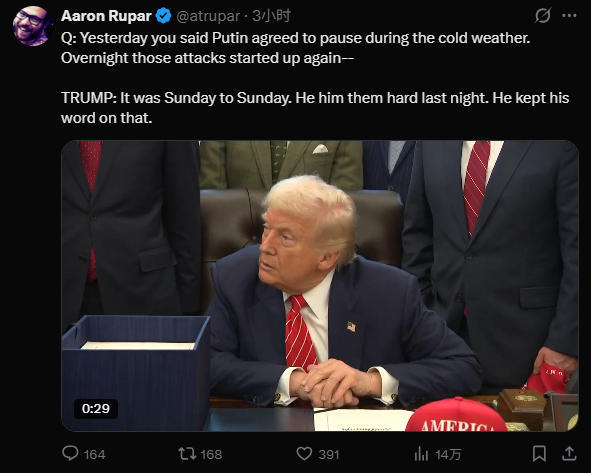 "(停火)从上上周日到上周日,然后就开了火,昨晚打得很猛,"特朗普回答说,"他(普京)信守了承诺。一周的时间很长。我们什么都愿意接受,因为那边真的非常非常冷。不过,袭击发生在上周日。他从上上周日一直停火到上周日。"