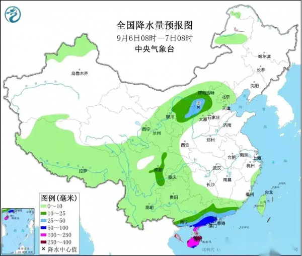 而9月6号降雨分布包括新疆、西藏、青海、甘肃、四川、云南、贵州、广西、重庆、陕西、宁夏、内蒙古、湖南、广东、岛屿、浙江、山西、河北、北京、天津等地部分地区有小到中雨,局部地区有大雨或暴雨,特别是广东西南部沿海和海南岛大部等地有大暴雨,局地特大暴雨。