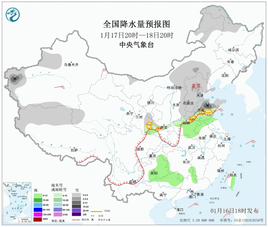 西北地区东部、华北南部、黄淮、江汉、江淮西部、江南北部等地有中到大雪或雨夹雪,陕西南部、山西南部、河南、山东、湖北中西部、湖南北部、安徽等地部分地区有暴雪,河南西部、湖北西部、湖南、贵州、重庆东部等地部分地区有冻雨;西南地区东部、江南南部、华南西部等地有小雨。