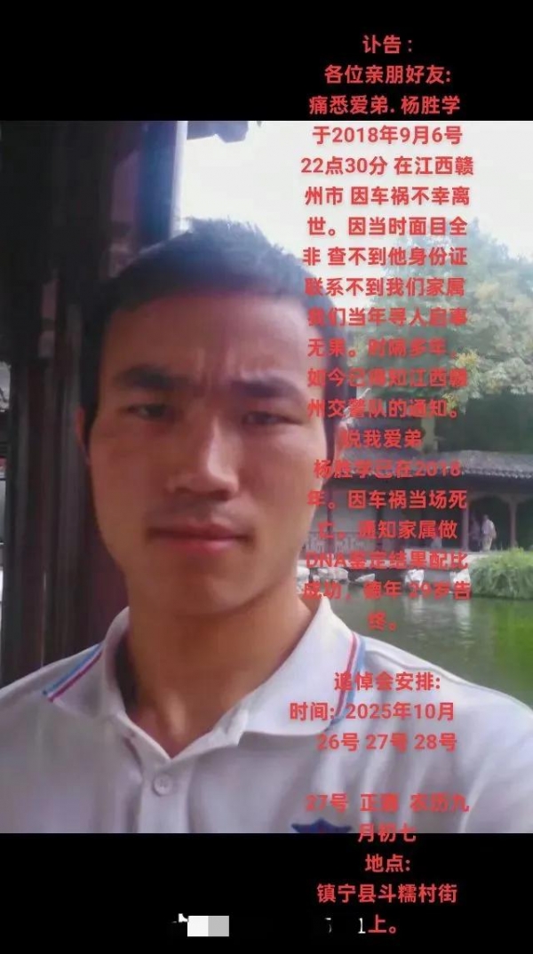 天崩开局!时隔七年,家属终于收到了关于失踪青年杨胜学的消息,让人痛心的是,男子在七年前已经因为一场车祸离世,年仅29岁,家人崩溃大哭。