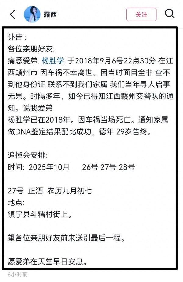 据悉,杨胜学是在2018年9月6号22:30,因车祸不幸离世,当时已经面目全非,无法辨认身份,所以导致家人寻亲无果。就这样,这场告别迟到了7年很多网友也感到无比痛惜