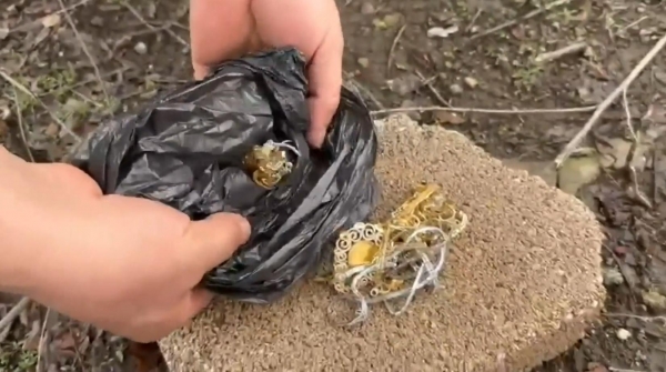 被盗物品装在一个黑色垃圾袋里埋藏,包括华丽的黄金戒指、项链和手镯。