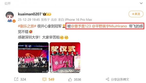 12 月 29 日晚,蒯曼发布了两条微博动态,第一条以 "蒯乐之旅" 为题,分享了自己对南京家乡美食的喜爱,直言钟情鸭血粉丝汤和各类糕点;第二条则配着夺冠相关话题,感慨 "很开心拿到冠军",再次调侃自己是被覃予萱和平野美宇 "带飞",同时感谢深圳大学团队的付出。