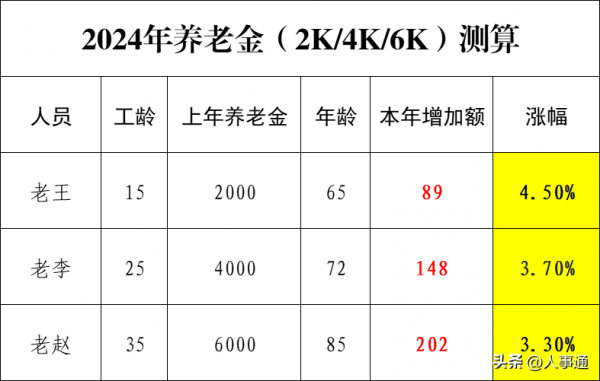 1.个人养老金2000元、4000元、6000元,养老金增加额方面,不会相差2倍或3倍。养老金涨幅方面,低的人涨幅会更高一些,比如:老王养老金2000元,涨幅达到4.5%,老赵养老金6000元,涨幅仅为3.3%。