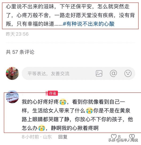 回顾其短暂的人生,真的太苦了,以至于悼念她的好友悲痛发文:看到你就像看到自己一样,生活给女人带来了什么,你是不是在黄泉路上眼睛都哭瞎了,你放心不下你的孩子,他怎么办………
