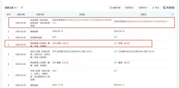 2025年5月,粤宝鑫发生人事及场所变更,原实控人戴伟退出,谈广出资100万元获得公司100%股权。此外,粤宝鑫原地址位于深圳市罗湖区翠竹街道水贝社区贝丽北路71号兴龙黄金珠宝大厦6楼601G,变更后为深圳市罗湖区桂园街道红村社区宝安南路2001号中政华庭3061。