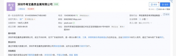 天眼查显示,粤宝鑫全称为深圳市粤宝鑫贵金属有限公司,公司成立于2023年8月,注册资本100万元。法定代表人及背后实际控制人为谈广,主营珠宝首饰销售、批发、回收、加工业务。