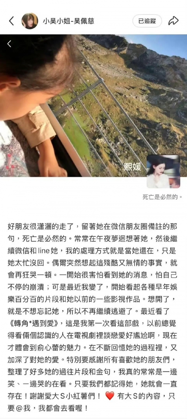 11月24日,吴佩慈在社交媒体上公开发文,首次曝光了已故好友大S(徐熙媛)生前的微信朋友圈截图。截图显示,大S的微信签名栏里写着这样一句话:"死亡是必然的"。这句充满哲思的签名,如今看来如同一语成谶的预言,令无数网友为之震撼。