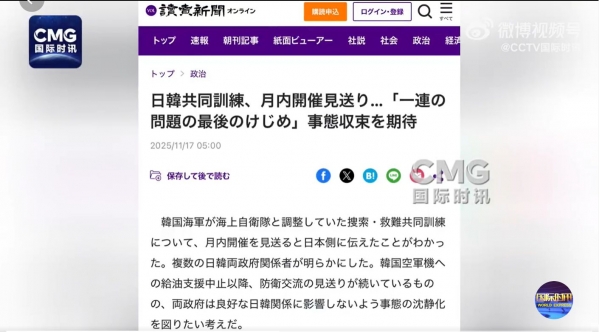 韩国海军11月17日向日本海上自卫队转达了暂停原定本月内举行的联合搜救演习的意向。日本防卫省官员回应称,双方将就演习时间进行重新调整。