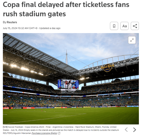 虽然2024美洲杯决赛的举办地迈阿密是美国最大的西语人口聚居城市,但办赛方就真的这么自信,其工作团队可以在既没有英文翻译,甚至没有在官网上进行公示的文件的情况下,对包括《安全规定》在内的一系列规定了然于心、无师自通、意念执行?