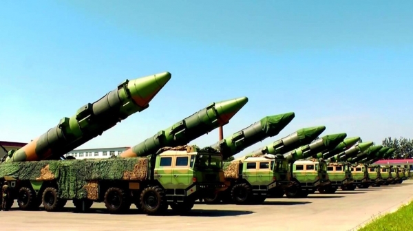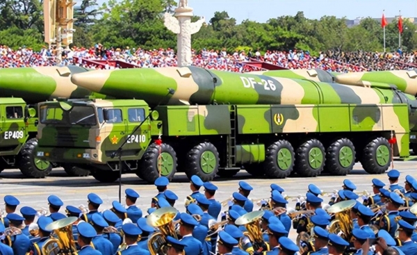 中国火箭军装备的东风-26型导弹射程达到4000公里以上,还能装备核弹头,有极强的反舰能力。