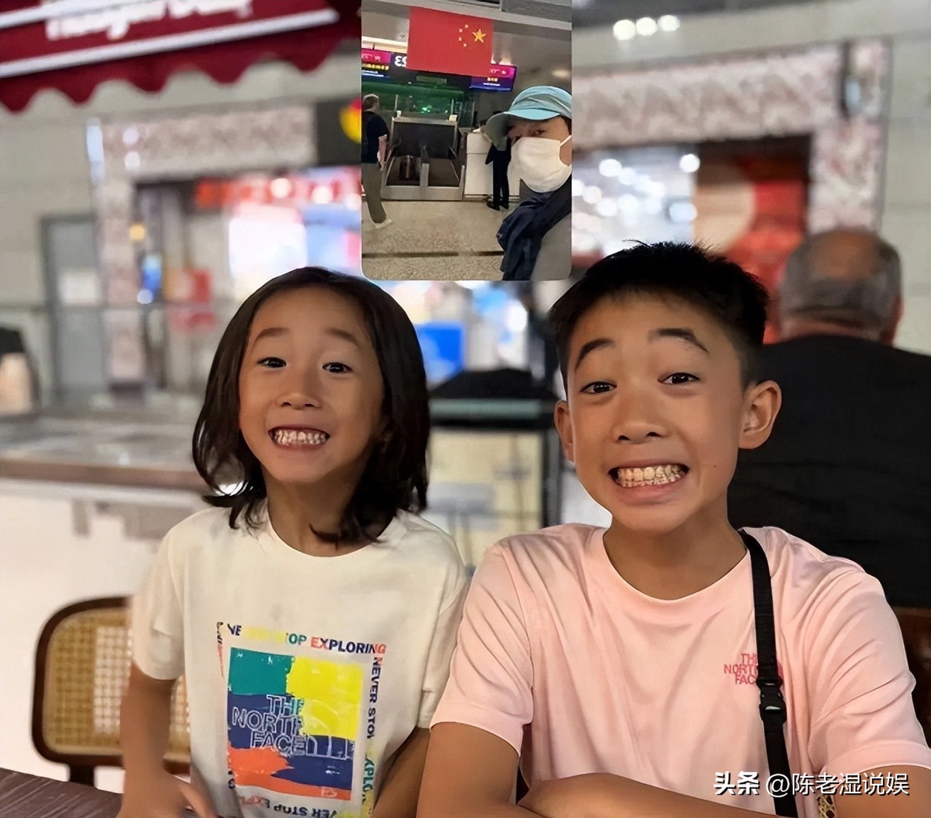 陈小春戴着口罩盯着镜头,而两个孩子则是呲着个大牙在那乐。