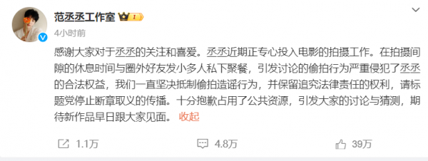 范丞丞工作室很快回应,表示感谢大家喜欢范丞丞,拍摄期间跟圈外发小好友聚会,偷拍行为侵犯了范丞丞合法权益,并期待新作品早日跟大家见面。