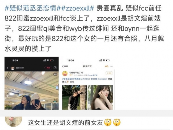 根据网友发出的时间线,zzoexxll跟范丞丞前女友秀友情时,就已经跟范丞丞在一起,不知道这件事情前女友是否知情。