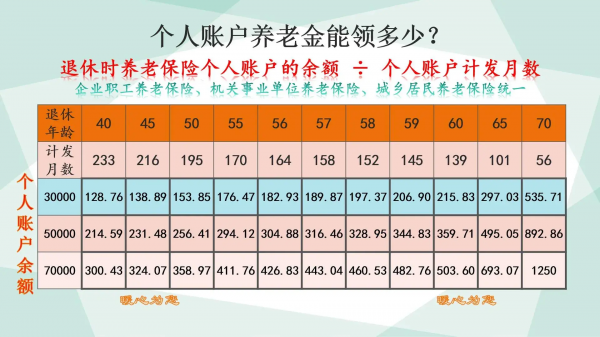 第二,个人账户养老金,等于养老保险个人账户的余额÷退休年龄确定的计发月数。