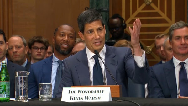 当地时间4月21日,美联储新主席提名人凯文·沃什出席美国参议院银行委员会确认听证会。彭博社视频截图