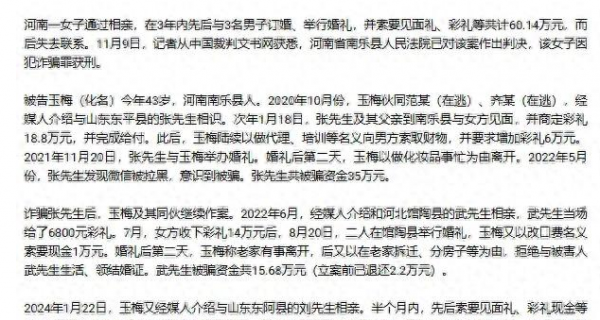 最近中国裁判文书网曝光的一起案件,把网友看呆了!河南南乐县43岁女子玉梅(化名),靠着相亲这门"生意",在2021年到2024年短短3年里,接连"拿下"3名男士,不仅订婚办婚礼样样齐全,还硬生生骗走了60.14万元彩礼,最后拍屁股跑路,简直把婚姻当成了敛财工具。