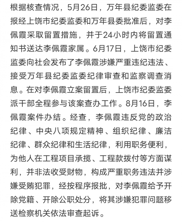 根据上饶官方通报:李佩霞案已经办结。经查明,李佩霞利用职务之便为他人在工程承揽、工程拨付款等方面谋利,并非法收受财物,构成受贿罪,对李佩霞开除党籍和公职处分,并将涉嫌犯罪问题移送检察机关审查起诉。