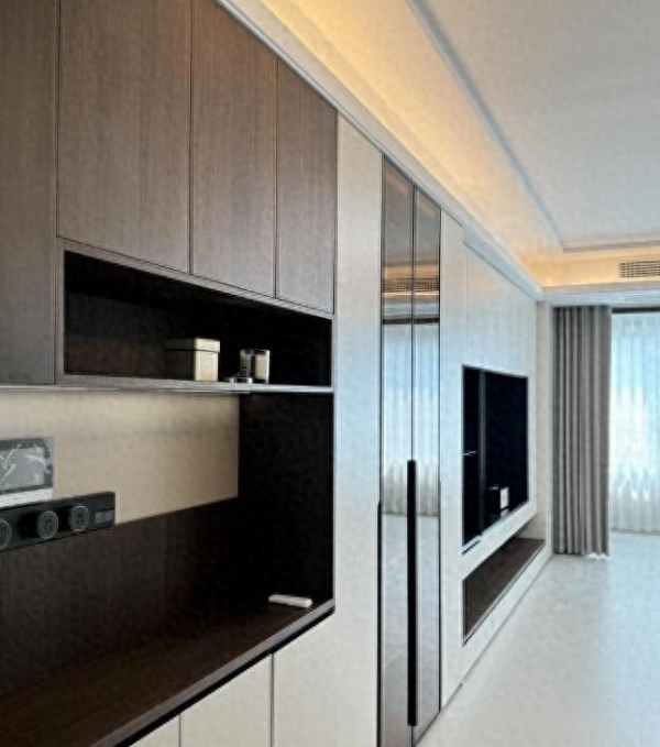 从进门到客厅,柜体在造型、颜色、比例上始终保持一致,看着就像是一个整体系统。