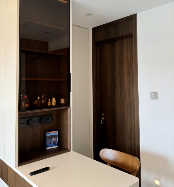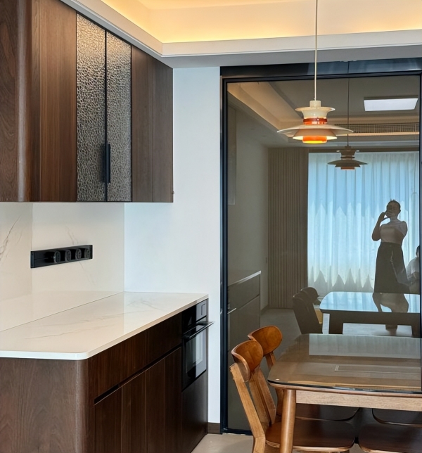 中间穿插的半透明棕色玻璃柜门,是一个非常加分的细节。
