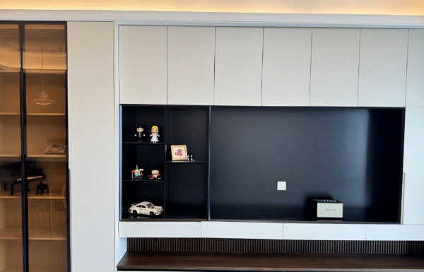 直接把电视墙整合进柜体系统里,电视只是其中的一部分,而不是主角。