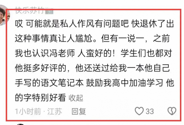 然而,也有学生认可冯老师的教学能力。他们提到冯老师送过一位同学笔记本,字写得特别好看。