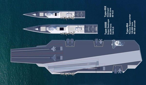 【004型航母和055B、新一代通用驱逐舰想象图】
