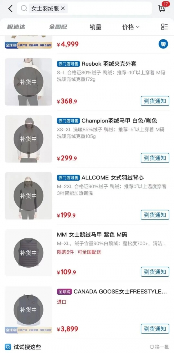 查阅山姆会员App发现,多款女士羽绒服、羽绒马甲都显示在补货中,售价从100元到400元不等。