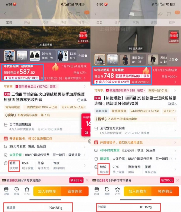 例如,山姆499元的羽绒服充绒量高达400克,Costco的359元款也有180克充绒量。而对比高端羽绒服,在电商平台找到两家大牌羽绒服发现,充绒量分别在111~159克、196~281克间的羽绒服,售价却分别为748元、587元,这意味着,在拥有更低充绒量的同时,其羽绒服的售价反而更高。