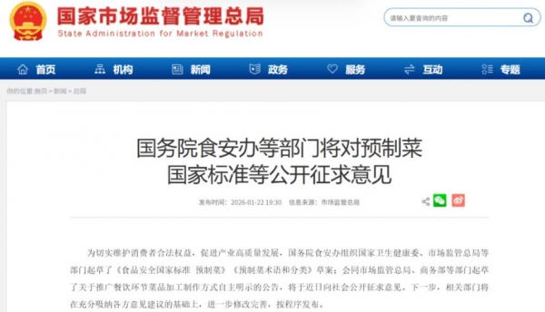 2026年1月22日,国务院食安办联合多部门扔下一颗"制度核弹":《食品安全国家标准 预制菜》《预制菜术语和分类》草案即将公开征求意见,并同步推动"餐饮环节必须明示是否使用预制菜"。