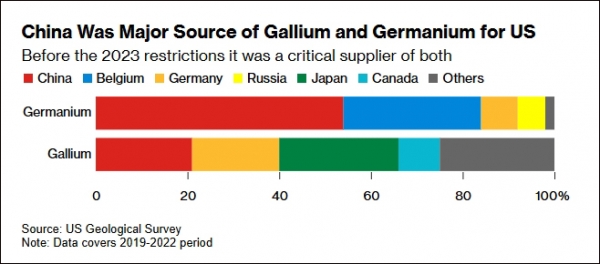 中国是美国镓和锗等关键矿物的主要来源国 彭博社制图