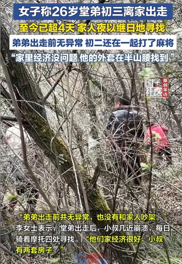 根据堂姐的透露,男子出走前没有异常也没有和家人吵架,吃饭时很融洽,并且男子家也有钱,家里有两套房子,即便男子现在不工作也完全能养的起他。