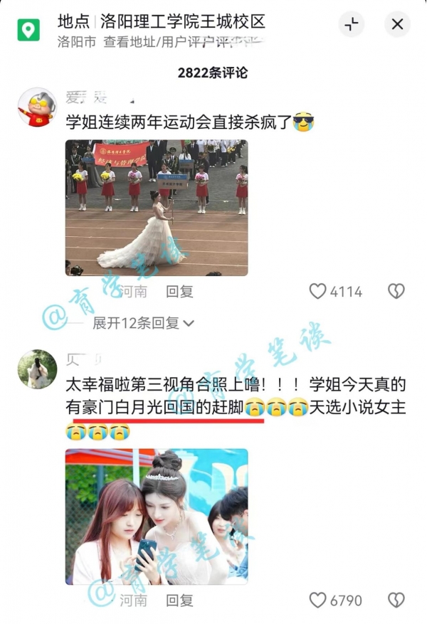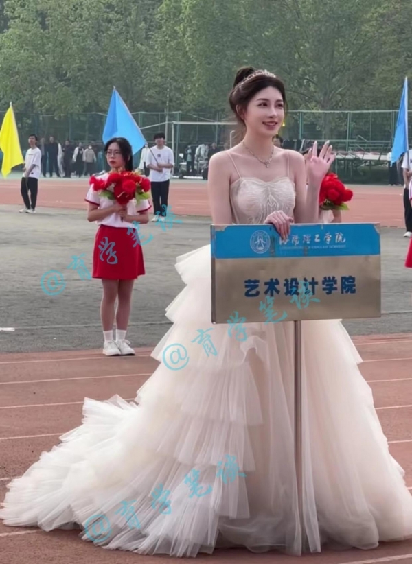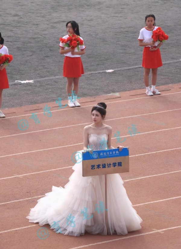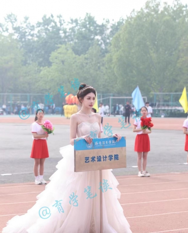 从女生"真真大王"分享的视频来看,她是洛阳理工学院艺术设计学院的一名大四学姐,学校近日举办了春季运动会,她代表学院举牌,没想到一出场就杀疯了!