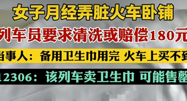 "全网吵翻!"近日,一则"女子月经弄脏火车卧铺被索赔180元"的消息冲上热搜,引发无数网友热议。