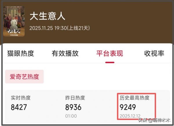 更让人哭笑不得的是,《大生意人》会员收官的日子是13号,这一天还是周六,可以称得上是热度上的话黄金时间。但是,该剧的热度在这一天却不增反降,收官日热度堪堪维持在9000以上。收官次日,也就是周日,该剧的热度直接跌破9000。完结之后,剧集的热度更是一跌再跌,该剧之后恐怕不会有太突出的长尾效应了。
