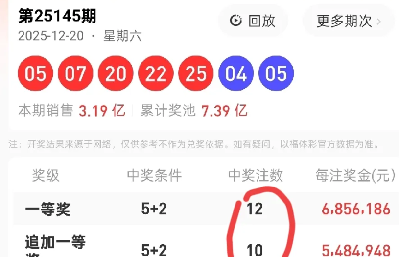 大乐透 25145 期又井喷啦!12 月 20 日周六晚开奖,这期奖池滚存 8.18 亿。开出的号码前区是 5、7、20、22、25,后区是 4、5。